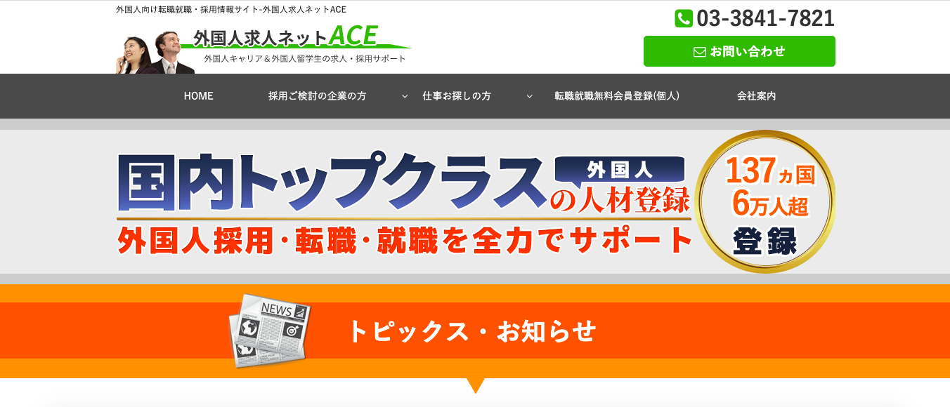 また、外国人求人ネットACEもおススメの紹介会社の1つと言えるでしょう。外国人求人ネットACEは高度外国人人材の採用に特化した紹介会社です。高度外国人人材とは、専門的なスキルや知識を持つ外国人労働者のことを言います。人材紹介のほかにも、外国人採用に関するコンサルティングもしています。外国人採用時の注意点などを知りたい方は相談してみるのも良いでしょう。また、求人広告の掲載も行っています。外国人労働者に対して企業の認知度を高めたい方はこちらを利用すると良いでしょう。求人掲載は技術系職種以外が対象であるため注意しましょう。