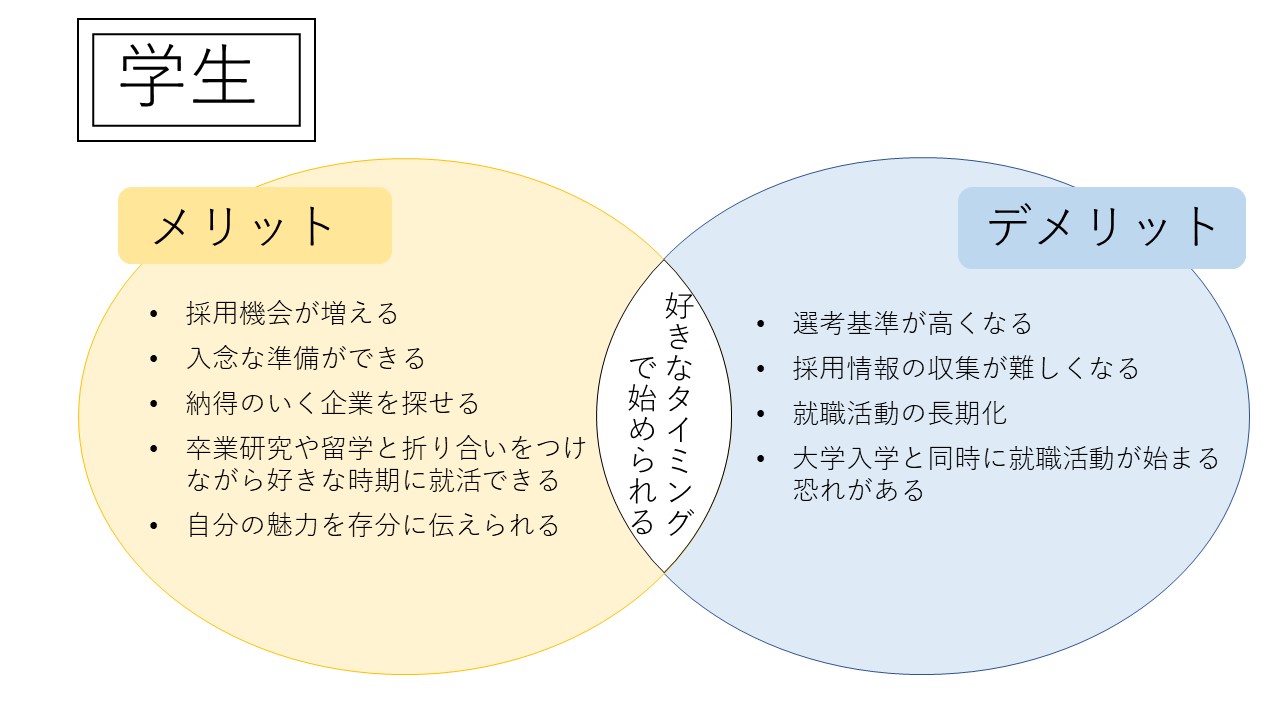 例えば、好きなタイミングで就職活動を始められることは就職意識の高い学生からするとメリットとなりますが、運動部など活動をしている学生や、就職活動について理解が浅い学生からすると、デメリットになると考えられます。