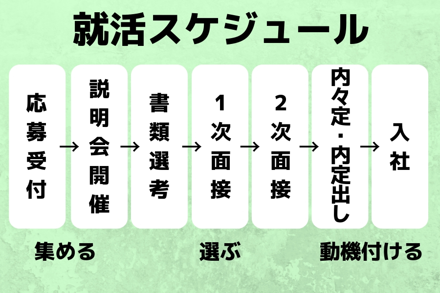 | 10月 | 内定式開催 選考試験・面接の開催 内定出し→ 収束へ |