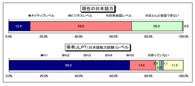 現在の日本語レベルについて外国人留学生に意識調査をした結果を表したデータを見てみると、ネイティブレベルは12.4%、ビジネスレベルの58%を加えると全体で70%以上の留学生がビジネスで日本語を運用する能力があると回答しています。