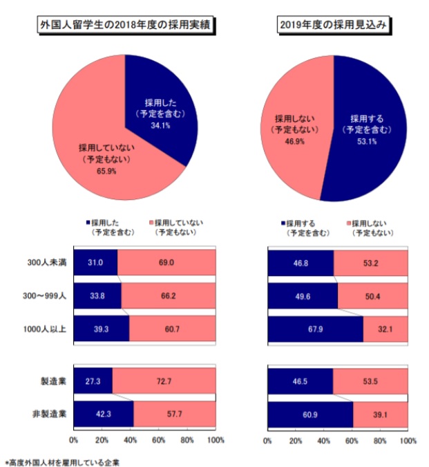 大卒以上を対象とする高度外国人材の採用の実績(予定を含む)企業が2018年度は34.1%に対し、2019年度の採用見込みは53.1%とおおよそ1.5倍の数字を示していることが判ります。