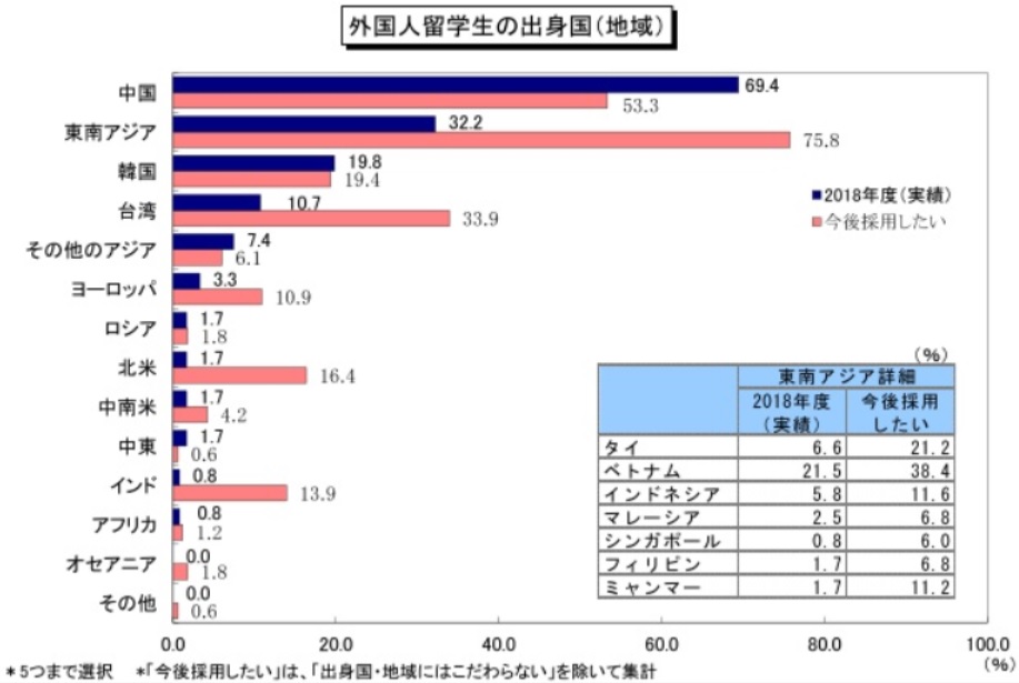 外国人留学生の出身国別データによると多くの企業が東南アジア出身の留学生を希望していることが全体の75%という数字に反映されています。