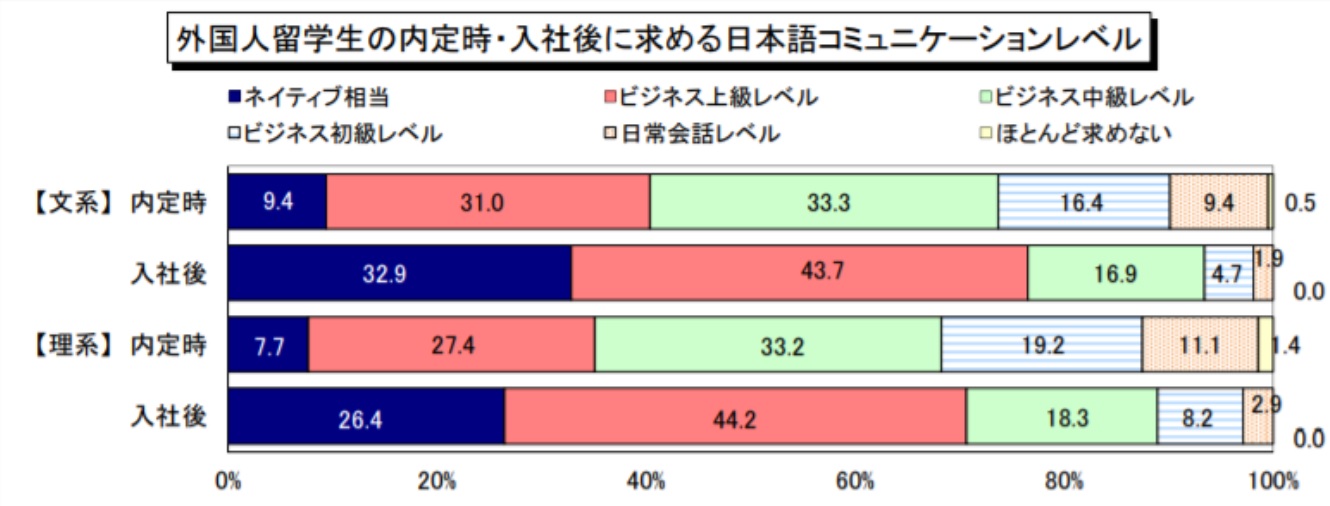 一方、外国人留学生を新卒採用する企業の日本語のレベルに対する意識調査のデータによると、入社の時点でビジネスの上級レベルを要求する企業は文系が48.4%、理系では43.8%を示しています。入社後の数字と比較してみると、文系81.5%、理系76.4%と急激に上昇しているのが判ります。これは実際の現場ではかなり高い水準の日本語能力が実践的に必要となっている現状を象徴している値と言えるでしょう。