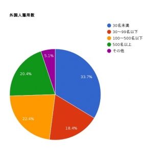 それぞれの企業の外国人採用数は、30名未満の外国人を採用した企業が33.9%、30~99名以下が18%、100~500名未満が22.5%、500名以上が0.5%となっています。