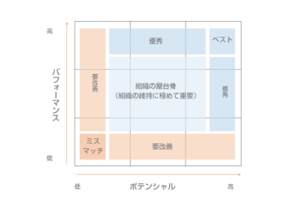 タレントレビューを実施する際に用いられるフォーマットとして、「9ボックス」というものがあります。9ボックスとは横軸にポテンシャル、縦軸にパフォーマンスを設定することで人材を9つのタイプに分ける評価方法です。9ボックスでは人材が持っている個性や特性などを明確にするため、点数によって社員の優劣をつけるということが目的ではありません。新たな評価方法の導入を検討している企業の方は、社員を定性的に評価するための手段として9ボックスを活用してみてもいいでしょう。