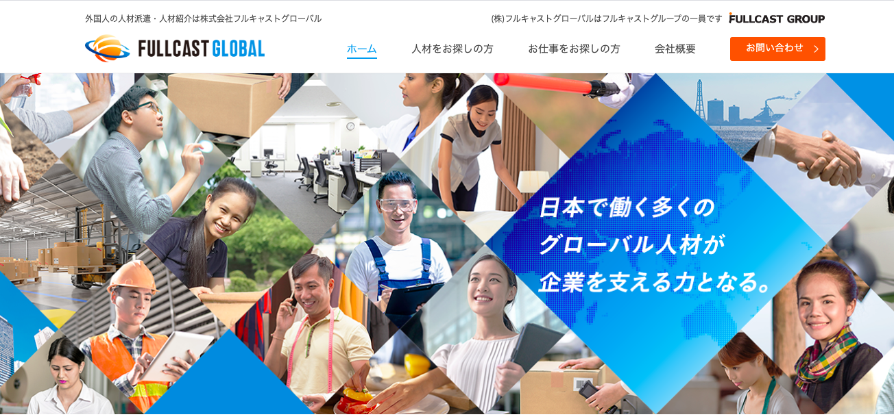 特定技能の対象国の外国人を採用する方法として、FULLCASTGLOBALを利用する方法もあげられるでしょう。FULLCASTGLOBALは総合人材サービスを行う株式会社フルキャストホールディングスの子会社、株式会社フルキャストグローバルが運営している外国人派遣、外国人紹介専門の求人サイト。FULLCASTGLOBALは出入国在留管理庁から特定技能の登録支援機関として登録されています。このことからもFULLCASTGLOBALは信頼性が高い求人サイトだと言えるでしょう。対象エリアである東京、神奈川、千葉、埼玉にある企業の方はFULLCASTGLOBALを利用してみてはいかがでしょうか。