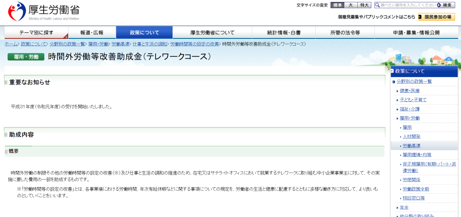 厚生労働省が管轄する時間外労働等改善助成金(テレワークコース)とは、時間外労働を改善する目的で助成されます。在宅又はサテライトオフィスにおいて就業するテレワークに取り組む中小企業事業主に対して、その実施に要した費用の一部を助成するものです。テレワーク導入にかかる備品費や機械装置等購入費などの対象経費の合計額を定められた補助率で助成する仕組みです。今年度の募集は受付を終了していましたが、新型コロナウィルスの感染拡大の対策として特例的なコースを設けて申請を受け付けると厚生労働省が発表しました。