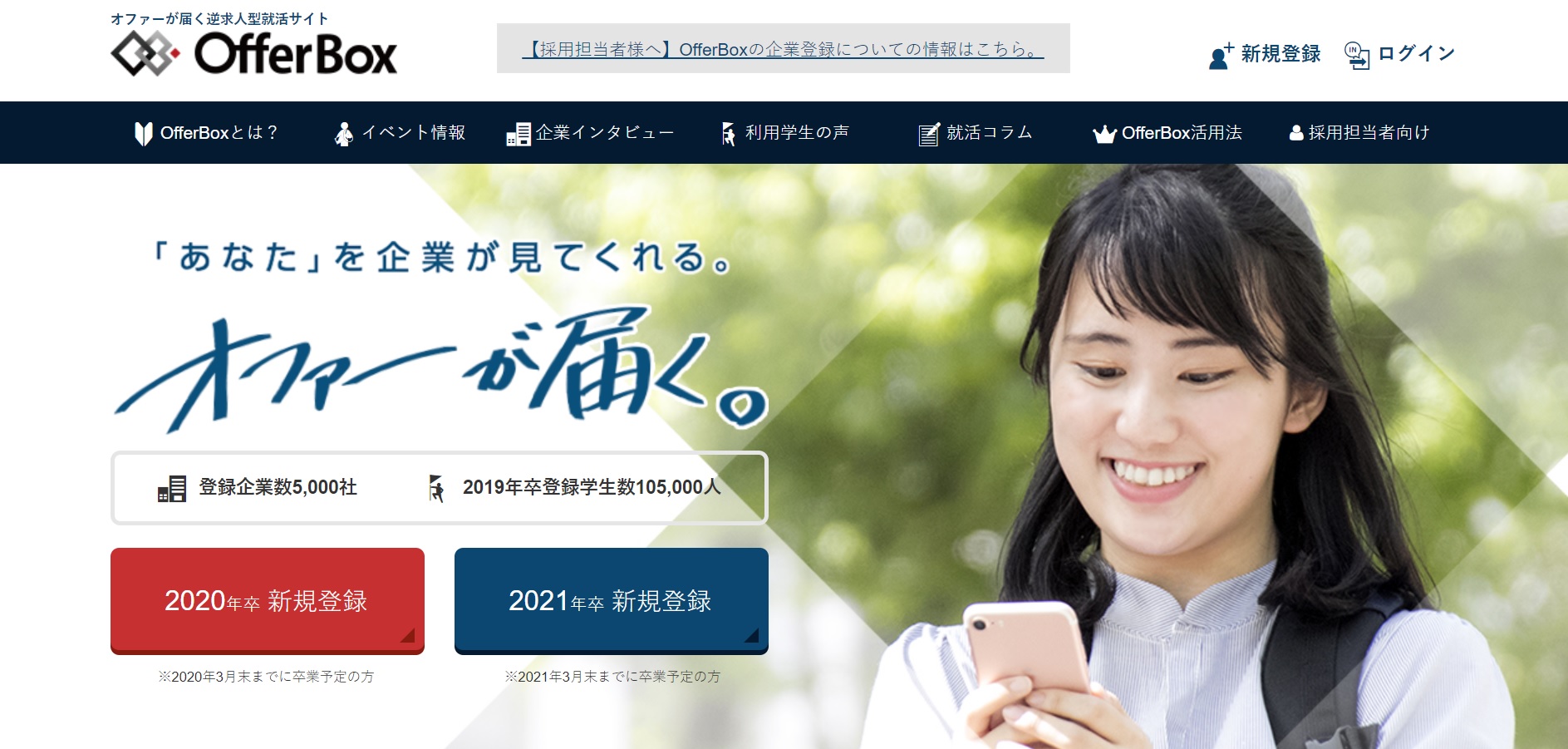 オファーボックスは学生がサイト内で自己表現することにより企業からオファーを受け取る逆求人型サイトです。文章を入力するだけでなく動画や研究スライド、写真を使うことができるので、企業と学生の良いマッチングが見込まれます。