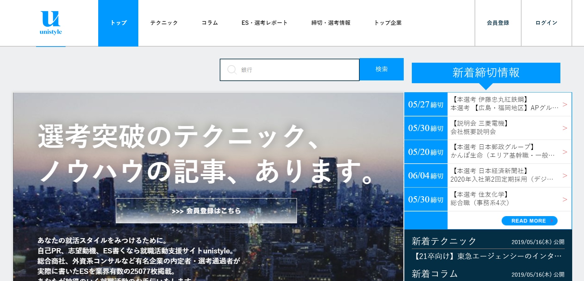 unistyleでは、就活生向けに具体的なES、グループディスカッションについての情報や、働き方、キャリアについての考え方のコラム等を掲載しています。2万5000枚以上のESを掲載しているということで、就活を始めたばかりの学生には特に役立つでしょう。