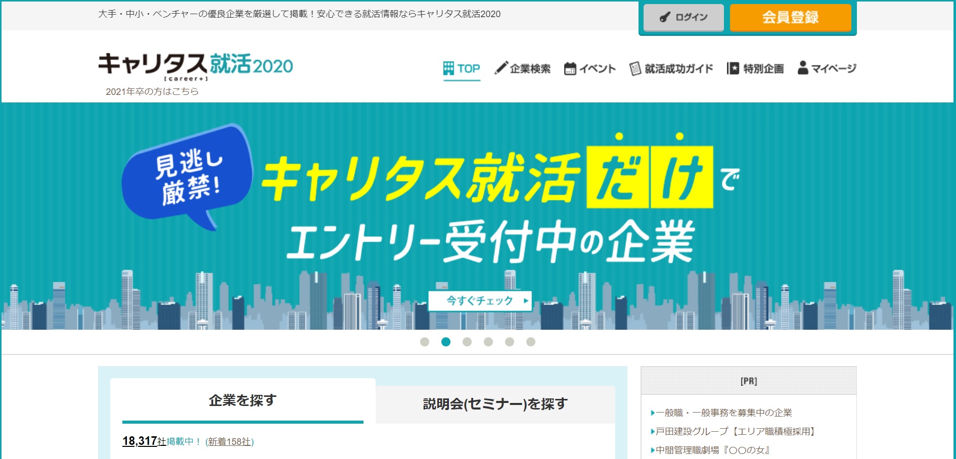 マイナビ、リクナビに続き、キャリタスが3位になりました。就活に役立つ情報を頻繁に発信しており、そのメールをよく読むという学生もいるようです。また、理系学生向け、女子学生向け、留学生向けなど、特定の学生をテーマにした特集を組んだり、イベントを開催したりしています。