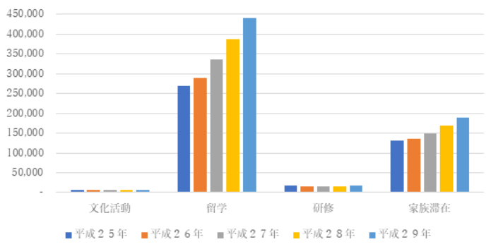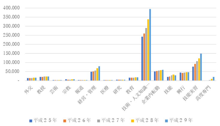 グラフでわかる通り、平成25年から平成29年の間はほとんどのビザが増加傾向にあります。また、2020年東京オリンピックや日本文化の人気上昇、ビザが緩和傾向にあることを考慮すると、今後も増加の傾向がみられると考えられます。