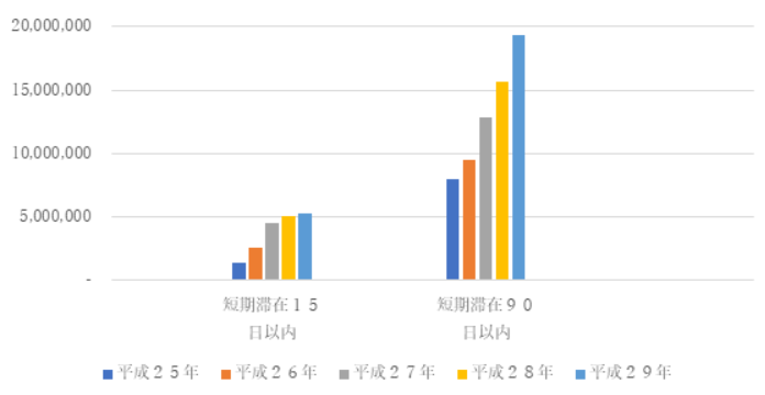 短期滞在ビザは15日以内、90日以内ともに常に増加しています。15日以内のビザは常に増加しており、平成26年から平成27年にかけてとくに増加しています。90日以内のビザも常に増加しており、就労の可否を問わずすべてのビザの中で最も取得者数が多くなっています。