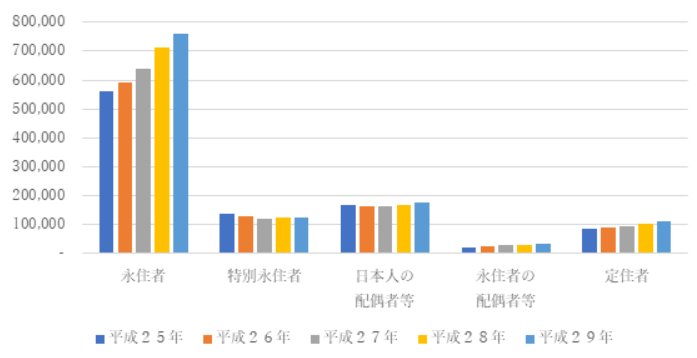 永住者の配偶者等は居住できるビザの中で最も増加しています。これは、永住者の増加に伴いその配偶者、子供等が増加しているためと考えられます。