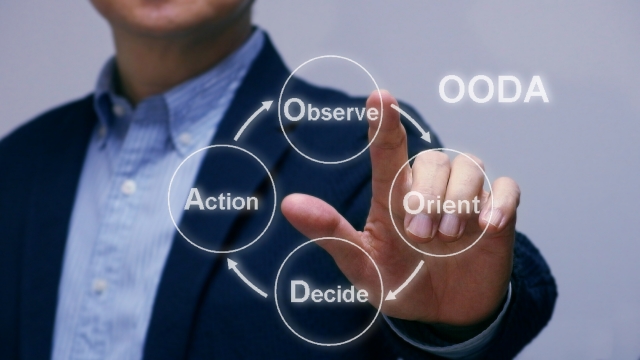 今までPlan(計画)・Do(実行)・Check(評価)・Action(改善)を繰り返すことによって継続的に改善していくPDCAサイクルが主流でした。しかし、VUCA時代を生き抜くのに役立つ思考法として注目されているのがOODAループです。Observe(観察)、Orient(適応・見定め)、Decide(決定)、Act(実行)の頭文字をとってつけられました。OODAループとは、PDCAサイクルといった従来の思考法よりも、刻々と変わっていく情勢に臨機応変に対応しやすい思考法です。